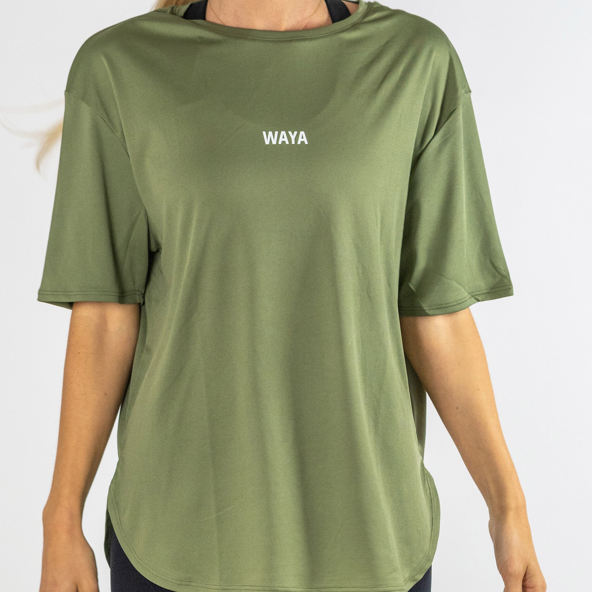 En längre rundhalsad träningstopp i svalt funktionsmaterial, designad med en lösare passform för en avslappnad och bekväm känsla. Toppen är längre och går ned över stussen med en fin rundad kant nedtill och är prydd med ett stilrent WAYA-tryck framtill.